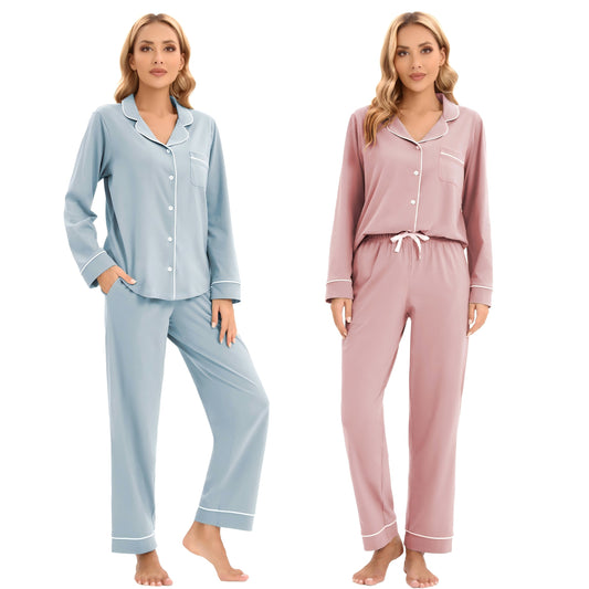 LUBOT 100% Cotton Pajamas for Women PJ Set Soft Button-Down 2 Piece Set Knitted Long Sleeve