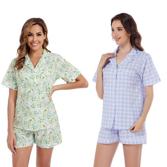 LUBOT 100% Cotton Pajamas for Women 2 Piece PJ Set Button-Down Soft Printed Knit Short Sleeve