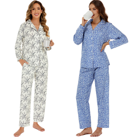 LUBOT 100% Cotton Pajamas for Women 2 Piece PJ Set Woven Poplin Ladies Button Down Long Sleeve Printed Sleepwear