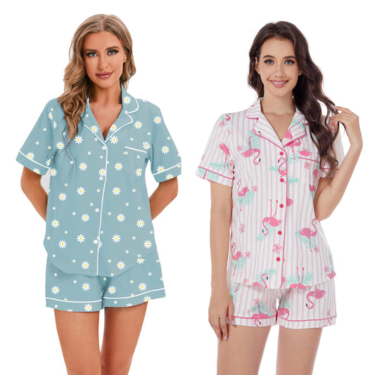 LUBOT 100% Cotton Pajamas for Women 2 Piece PJ Set Button-Down Soft Printed Knit Short Sleeve